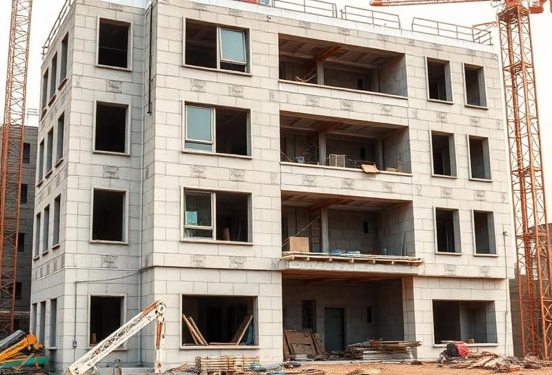 Aerial view of a concrete block structure under construction.